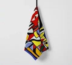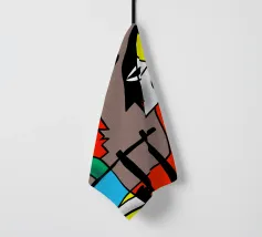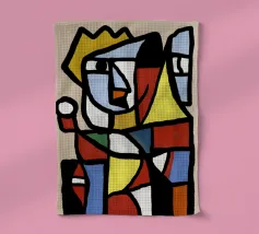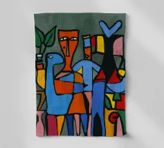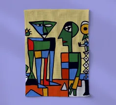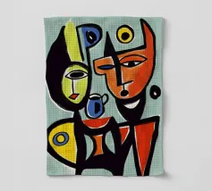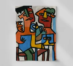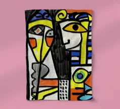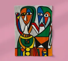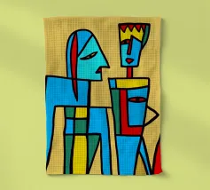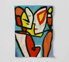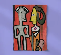 Due figure stilizzate dominano la composizione, caratterizzate da forme astratte e colori vivaci. Una figura appare di profilo mentre l'altra è rivolta in avanti, entrambe con tratti esagerati e una qualità stravagante.