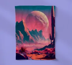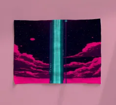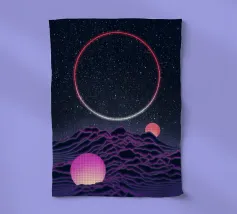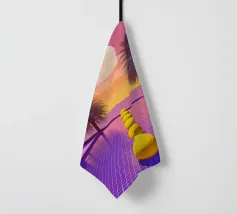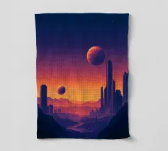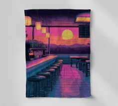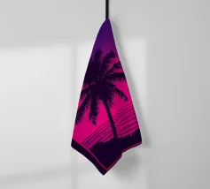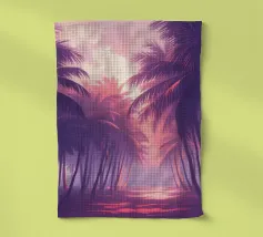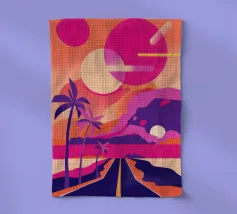 Questo motivo mostra una scena suggestiva in stile retrofuturistico: un enorme sole al tramonto colora il cielo di forti tonalità di giallo e magenta mentre sprofonda dietro una scura catena montuosa. In primo piano corre un pavimento luminoso a griglia che crea una prospettiva in profondità e termina in un corso d'acqua riflettente. Palme tropicali incorniciano l'immagine a sinistra e a destra. Lo stile visivo ricorda l'estetica synthwave e combina elementi naturali con immagini digitali.