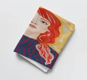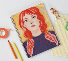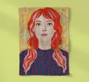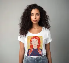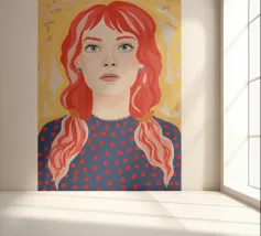 Una giovane ragazza con trecce rosso vivo guarda in avanti su uno sfondo dorato in stile pop surreale.