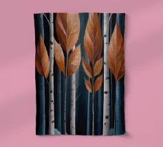 Il dipinto digitale di una foresta autunnale presenta sagome scure di alberi su uno sfondo caldo e dorato. L'opera d'arte testurizzata mostra un fogliame dettagliato nei toni dell'arancione e del marrone, creando una scena di bosco serena e suggestiva.