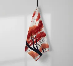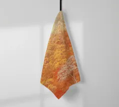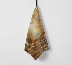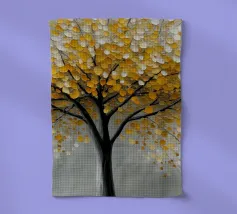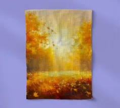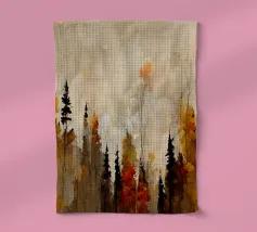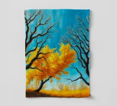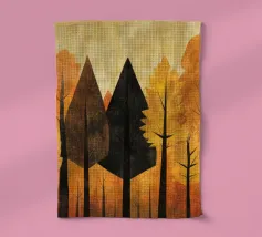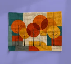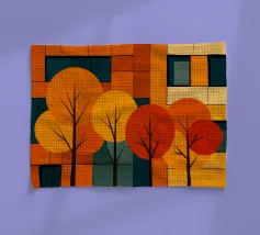 Una splendida rappresentazione astratta di una foresta autunnale con alti tronchi scuri e fogliame dorato. Lo sfondo caldo e luminoso esalta la composizione geometrica, creando un'atmosfera serena e moderna.
