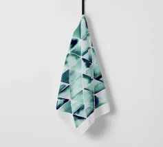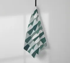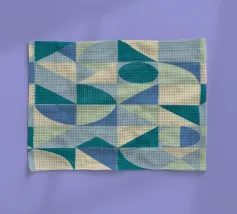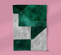 Le forme geometriche sono disposte su uno sfondo strutturato, caratterizzato da un motivo a griglia verde acqua. I triangoli di varie tonalità creano un contrasto visivo dinamico.