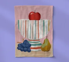 Una natura morta semplice e classica con una ciotola a righe con una mela, una pera e dell'uva, su uno sfondo rosa.