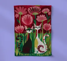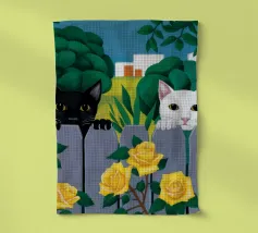 Un'affascinante raffigurazione di un gatto bianco e nero, probabilmente un gatto Tuxedo, seduto serenamente su un muro o un gradino di pietra danneggiato dalle intemperie. Il morbido fogliame verde e i delicati fiori rossi fanno da sfondo alla natura.