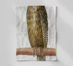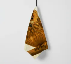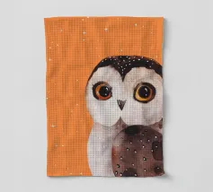 Un dipinto a olio di un gufo dall'aspetto simpatico e divertente. Si tratta di un uccello marrone chiaro con grandi occhi arancioni. Gli occhi del gufo sono un po' irregolari, il che lo fa sembrare ancora più buffo e dolce. Sembra anche un po' spaventato con i suoi occhi rotondi.