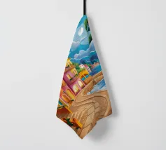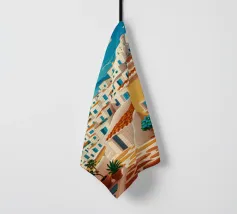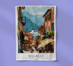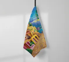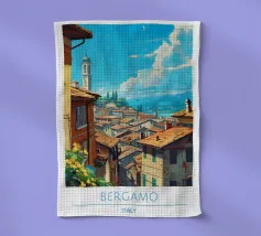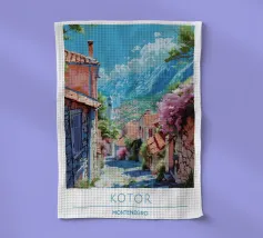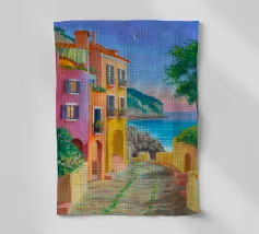 Una veduta prospettica di una strada europea stretta e tortuosa, fiancheggiata da edifici colorati, piante in vaso e diretta verso un cielo luminoso e nuvoloso.