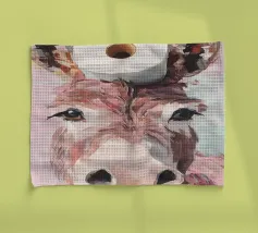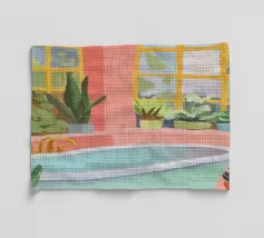 Un'illustrazione umoristica per il bagno degli ospiti: "Siediti, non fare pipì in piedi!". - in colori pastello e design minimalista delle piastrelle, perfetto per un bagno moderno.