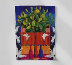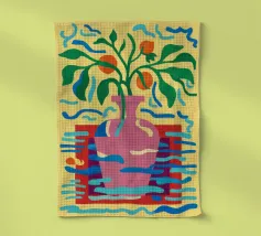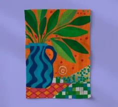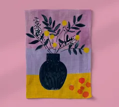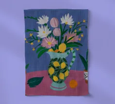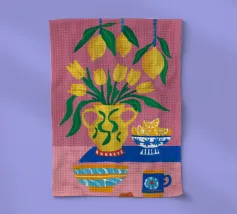 Un vivace bouquet di fiori e agrumi si trova in un vaso blu su un tavolo rosa. Lo sfondo è un mix dinamico di motivi a zig zag in bianco e nero e foglie verdi, che creano una natura morta moderna e giocosa.