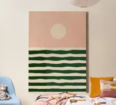 Opera d'arte minimalista su sfondo color crema con elementi verticali in blu e pesca. Le aree blu sono strutturate e opache, mentre quelle color pesca sono sottili e lisce. La disposizione crea ritmo e movimento verticale, mentre forme geometriche chiare caratterizzano la composizione.