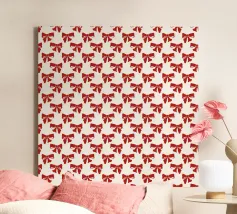 Un motivo ripetuto presenta forme geometriche rosse e bianche su uno sfondo rosa tenue. Ogni forma assomiglia a un semicerchio impilato su un trapezio, creando un disegno coeso e ritmico.