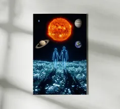 Immergetevi in un viaggio cosmico mozzafiato con questa vibrante opera d'arte fantascientifica che raffigura una silhouette solitaria sopra una griglia spazio-temporale incandescente che si trasforma in un vortice ipnotico. In alto, una nebulosa esplosiva di blu, verde e viola abbaglianti illumina l'universo, circondato dalla Terra, da Marte e da una luna radiosa. Questo disegno fonde surrealismo, astronomia e geometria futuristica: perfetto per i sognatori, gli amanti dello spazio e i collezionisti di arte moderna alla ricerca di un pezzo audace e ispiratore.