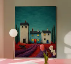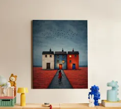 Three silent shapes against the breeze, Standing still on the edge of time, With windows like heavy, shuttered eyes O’er a field of poppies and sighs. The earth burns with an ancient red, While the sky, in its weary green, Rests on the roofs like a secret unsaid. No footstep falls, no voice is heard, Only the wait for those long gone, Midst barren trees with blossoms of blood.