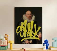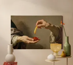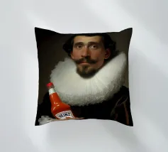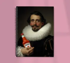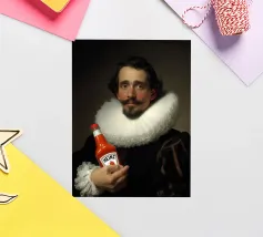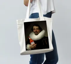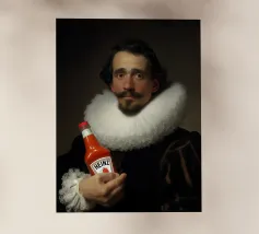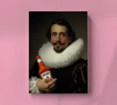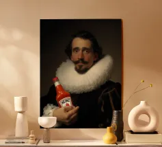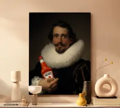 Questa brillante composizione anacronistica mostra un gentiluomo nello stile dell'Età dell'Oro con una moderna bottiglia Heinz. La magistrale tecnica del chiaroscuro ricorda la ritrattistica di Frans Hals, mentre la surreale collocazione del prodotto respira puro dadaismo. Un'immagine da milioni di dollari che incontra i prodotti di massa: un commento geniale sulla società dei consumi. Perfetto per gli amanti dell'arte con un debole per l'ironia e per tutti coloro che amano mettere in discussione il consolidato. E naturalmente per tutti gli amici del famoso marchio.
