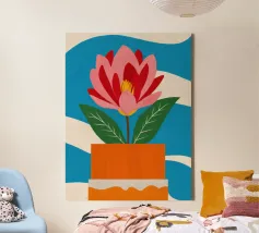 Una composizione botanica audace e grafica presenta un grande ramo stilizzato di foglie rosse arancioni su uno sfondo di forme astratte, creando una dichiarazione potente e moderna.
