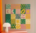 A cheerful and colorful pattern composed of a grid of squares, each filled with different playful, geometric, and organic designs. The artwork has the warm, joyful feel of a modern, handcrafted quilt.