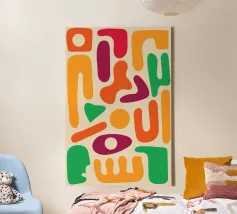 Questo disegno presenta una composizione astratta di linee e forme fluide in colori vivaci. Gli elementi sono disposti in modo armonioso e conferiscono al disegno un aspetto dinamico e giocoso.