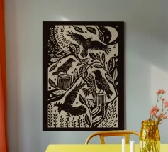 Questa silhouette mostra un albero nodoso e consumato dalle intemperie, con fili di muschio pendenti su cui sono appollaiati diversi corvi. Due lanterne pendono dai rami, mentre i pipistrelli volano sullo sfondo. Il disegno trasmette un'atmosfera misteriosa e un po' cupa che ricorda vecchie leggende o mondi fantastici. Ideale per gli appassionati di stile gotico, estetica fiabesca o decorazioni di Halloween. Il contrasto minimalista tra il nero e lo sfondo chiaro aumenta l'effetto drammatico.