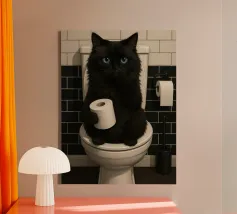 Divertente arte del bagno che ritrae la Monna Lisa seduta su un water di porcellana bianca su uno sfondo di pannelli di legno scuro. Una mano tiene in grembo un fazzoletto di carta stropicciato, l'altra ne porta un altro al naso. Pavimento con piastrelle a scacchiera bianche e nere e porta carta igienica dorato con un rotolo di carta igienica. A lato della toilette c'è un portascopino dorato coordinato. Nel complesso, l'immagine è quella dell'iconico ritratto di Monna Lisa con un'assurda circostanza di lei che usa il bagno. Il risultato è un ritratto classico e umoristico.