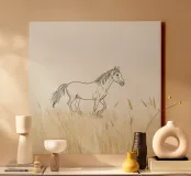 Cavallo che cammina tra l'erba dorata in un prato tranquillo tela