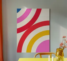 design retrò, estetica rosa, arcobaleno astratto, linee curve, strisce colorate, vibrazioni vintage, arte rossa e rosa, minimalismo astratto, ispirazione anni '70, tendenza arredamento moderno, motivo geometrico, palette di colori audaci