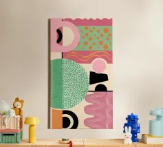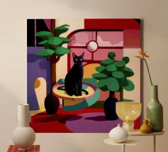 Una scena d'interni mostra una stanza vivace con pareti blu, piante rigogliose e un letto con un'audace coperta zebrata. La composizione è un mix giocoso ed elegante di motivi e colori vivaci, che crea un'atmosfera trendy ed energica.