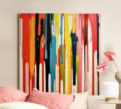 I colori vibranti si fondono in forme liquide. I gialli, gli arancioni e i rossi sgocciolanti confluiscono l'uno nell'altro e incontrano flussi freddi di viola e bianco. La texture ricorda il colore fuso o le sostanze cerose che interagiscono in una danza armoniosa ma dinamica. L'interazione tra caldo e freddo, luce e ombra crea un equilibrio accattivante di intensità ed eleganza.