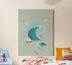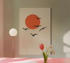 This poster captures the essence of calm with a minimalist sunset (or sunrise) over the ocean. The textured golden circle and silhouetted seagulls create a retro and refined atmosphere. It is perfect for bringing a feeling of vacation or relaxation into a bedroom, living room, or bathroom.
