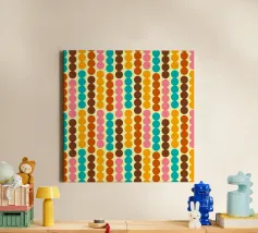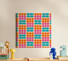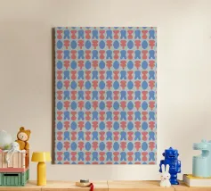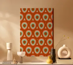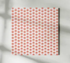 Un motivo geometrico ripetitivo presenta file alternate di semicerchi e cerchi nei colori blu e ruggine su uno sfondo chiaro. Il disegno crea un senso di ritmo e movimento grazie alla sua disposizione simmetrica.