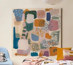 Una vibrante composizione astratta che ricorda una trapunta patchwork, con vari blocchi di colore, motivi geometrici e texture che creano un disegno vivace e tattile.