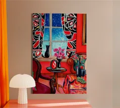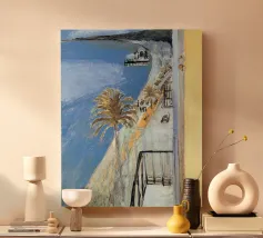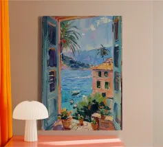vista di una barca a vela da dietro la finestra tela