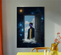 Questa opera d'arte surreale cattura un momento sognante di curiosità e immaginazione: un bambino che indossa un casco da astronauta si trova davanti a una finestra luminosa e guarda in un cielo pieno di stelle dove appare un misterioso UFO. La luce calda della stanza contrasta meravigliosamente con la profonda notte cosmica all'esterno, creando un'atmosfera cinematografica e nostalgica. Perfetta per gli amanti dello spazio, gli appassionati di fantascienza e i sognatori di tutte le età, questa stampa aggiunge ispirazione, mistero e narrazione a qualsiasi interno moderno, camera da letto, stanza dei giochi, ufficio o spazio creativo.