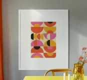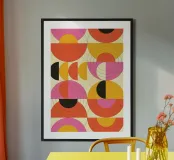 Un poster vivace e giocoso con un intricato motivo ripetuto di forme geometriche astratte, principalmente semicerchi e quadranti. Il disegno utilizza una palette di colori audaci e retrò: rosa caldo, arancione intenso, giallo senape e nero, su uno sfondo caldo color crema. Linee nere sottili e concentriche si sovrappongono a diverse forme, aggiungendo un tocco tecnico e moderno di metà secolo. Questo file poster digitale di qualità superiore (7000x5000 pixel, 300 dpi) garantisce dettagli ad alta risoluzione e colori ricchi e saturi, per una dichiarazione d'interni davvero groovy.