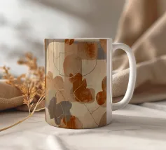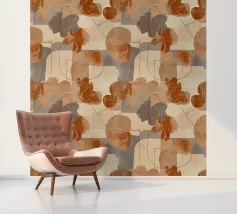 Un sofisticato motivo astratto che combina motivi di foglie botaniche con forme geometriche art déco nei caldi toni della terra: arancio ruggine, terra di Siena bruciata, grigio e crema.