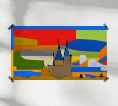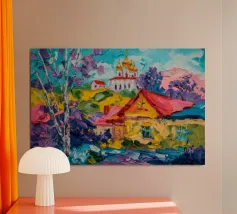 Quadro astratto dinamico che presenta un'architettura surreale, vivaci toni arancioni e blu, alberi astratti e sfere fluttuanti in un paesaggio fantastico. I tratti strutturati e i contrasti decisi creano un'atmosfera onirica ed energica.