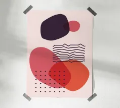 Forme geometriche astratte nei toni del rosso e del marrone si sovrappongono e interagiscono tra loro, creando una composizione dinamica. Le curve morbide e le linee rette si fondono armoniosamente su uno sfondo neutro.