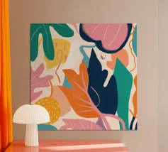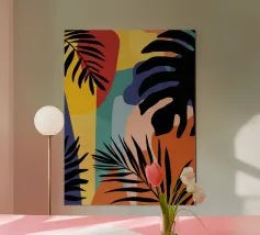 Una giocosa composizione astratta, ricca di audaci forme ispirate alla giungla e di pennellate vivaci. Questo disegno a mano combina verde acqua, blush, senape e menta in un layout gioioso e contemporaneo, perfetto per ravvivare gli interni moderni con un tocco tropicale.