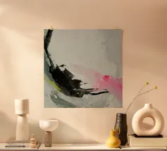 Ampia pittura astratta gestuale nei toni del rosa, del magenta, del marrone, del nero e del grigio con pennellate smaltate beige chiaro.