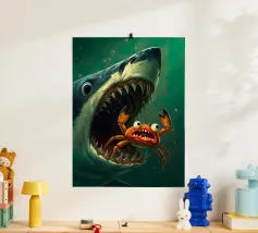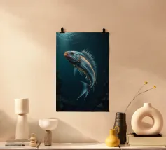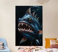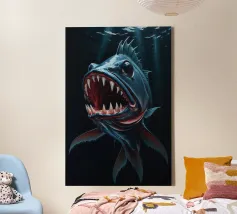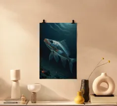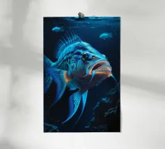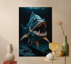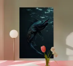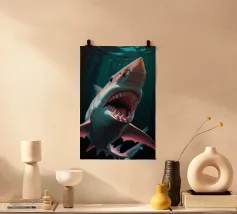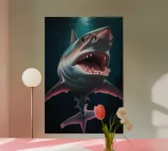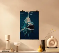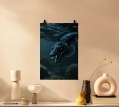 Questa rappresentazione iperrealistica di un predatore delle profondità marine mette in mostra i suoi denti affilati e la sua bocca cavernosa, pronta a colpire nell'eterna oscurità delle profondità oceaniche. I riflessi luminosi nei suoi giganteschi occhi neri aggiungono un tocco inquietante, alludendo a un cacciatore di vertice costruito per sopravvivere negli abissi. I raggi d'acqua illuminati dall'alto creano un contrasto inquietante con il suo corpo blu scuro, quasi metallico. Questa opera d'arte digitale cattura perfettamente il terrore e la bellezza dei più temibili abitanti dell'oceano.