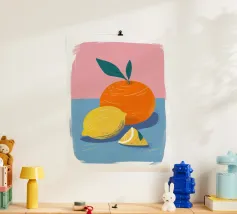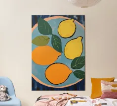 Una natura morta mediterranea con limoni e foglie verdi in tenui colori pastello è presentata in un motivo grafico a quadri. Questa illustrazione di ispirazione vintage dona un tocco di estate tropicale a qualsiasi cucina e celebra la freschezza di frutta e verdura biologica.
