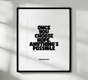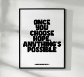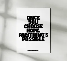 Poster tipografico in bianco e nero con la citazione ispiratrice di Christopher Reeve: "Una volta scelta la speranza, tutto è possibile". Un design luminoso e minimalista, perfetto per il salotto, la camera da letto o l'ufficio, per ricordare ogni giorno che la speranza apre le porte delle possibilità e aiuta a superare le difficoltà.