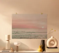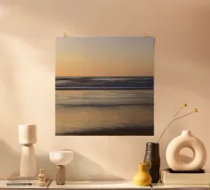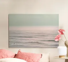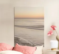 Questa tranquilla opera d'arte cattura un'alba mozzafiato su una spiaggia nebbiosa. Il cielo tenue e pastello e le onde delicate creano un'atmosfera rilassante e pacifica, perfetta per un arredamento ispirato al relax.