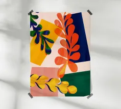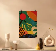 Un'audace composizione astratta presenta forme organiche in vibranti tonalità di arancio, blu e verde. Una grande forma verde simile a una foglia contrasta con il caldo sfondo arancione e rosso.