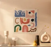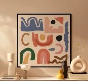 Una collezione di forme astratte dai toni terrosi, tra cui archi, linee e curve, disposte in una composizione equilibrata in stile bohémien.
