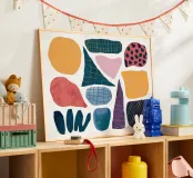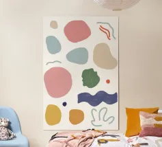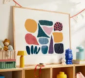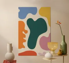 Una composizione astratta di forme assemblate con varie texture e motivi, tra cui griglie e punti. La sofisticata palette di colori e la disposizione equilibrata le conferiscono un'atmosfera da metà secolo moderno.