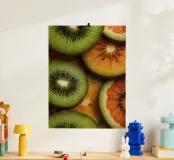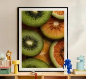 Le fette di kiwi, arance e pompelmi dai colori vivaci sono disposte in modo splendido. I frutti vibranti brillano di umidità, creando un'esposizione appetitosa.
