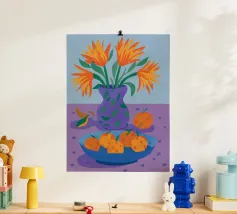 Un'elegante e semplice natura morta con un bouquet di fiori gialli in un vaso scuro accanto a una ciotola blu profondo piena di arance fresche. La composizione è serena e senza tempo, con un bel contrasto di colori.
