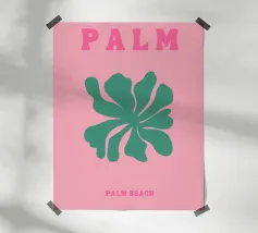 Un poster moderno di ispirazione pop art con il basilico come motivo grafico principale. Le foglie stilizzate di colore verde intenso spiccano sullo sfondo rosa acceso, completate dalla scritta "BASIL" in blu scuro.