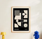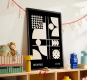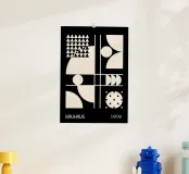 Un poster digitale dinamico che celebra la fondazione del Bauhaus nel 1919. La composizione monocromatica presenta una griglia asimmetrica che divide la tela in diversi studi geometrici, tutti in nero e bianco sporco ad alto contrasto. Combina grandi blocchi di forme astratte (cerchi, archi e quadrati) con elementi come una griglia di triangoli e un cerchio disseminato di punti neri. Le linee bianche definiscono la struttura, incarnando l'attenzione modernista per le forme di base e la composizione astratta. Questo download digitale premium vanta 7000x5000 pixel a 300 dpi, assicurando una chiarezza eccezionale e una qualità di stampa superiore.