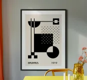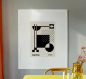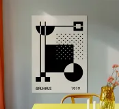Un poster digitale di grande impatto che celebra la fondazione del Bauhaus nel 1919. Questa composizione monocromatica e asimmetrica presenta un gioco di forme geometriche di base - quadrati, cerchi, linee e semicerchi - in nero e bianco sporco ad alto contrasto. Il disegno utilizza linee nere spesse per la struttura, in contrasto con modelli giocosi di punti bianchi e neri che riempiono le diverse sezioni. Questo pezzo è una potente rappresentazione dell'estetica funzionalista e sperimentale del Modernismo minimalista. Questo download digitale di alta qualità vanta 7000x5000 pixel a 300 dpi, garantendo una chiarezza e una qualità eccezionali.