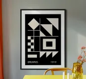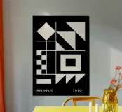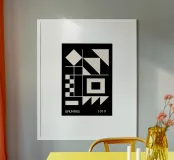 Un poster digitale molto complesso che celebra la fondazione del Bauhaus nel 1919. Questo disegno monocromatico presenta una griglia frammentata di forme geometriche - quadrati, triangoli e forme annidate - in nero e bianco sporco ad alto contrasto. La composizione comprende un motivo a scacchiera, quadrati ruotati e triangoli astratti, tutti definiti da sottili linee bianche. Questo pezzo incarna l'estetica funzionalista e sperimentale del modernismo minimalista. Questo download digitale di alta qualità vanta 7000x5000 pixel a 300 dpi, garantendo una chiarezza eccezionale e una qualità di stampa superiore.